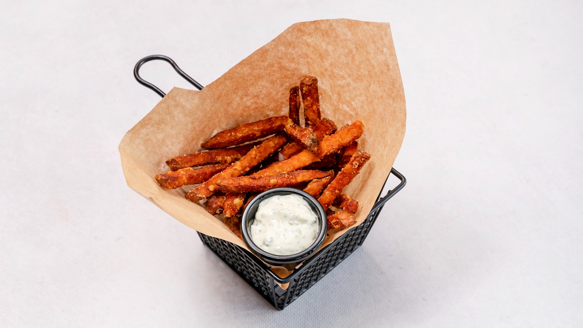 200 g wołowiny, bekon, ser, pomidor, sałata, cebula czerwona, majonez bazyliowy podawany podawany z frytkami i sałatką