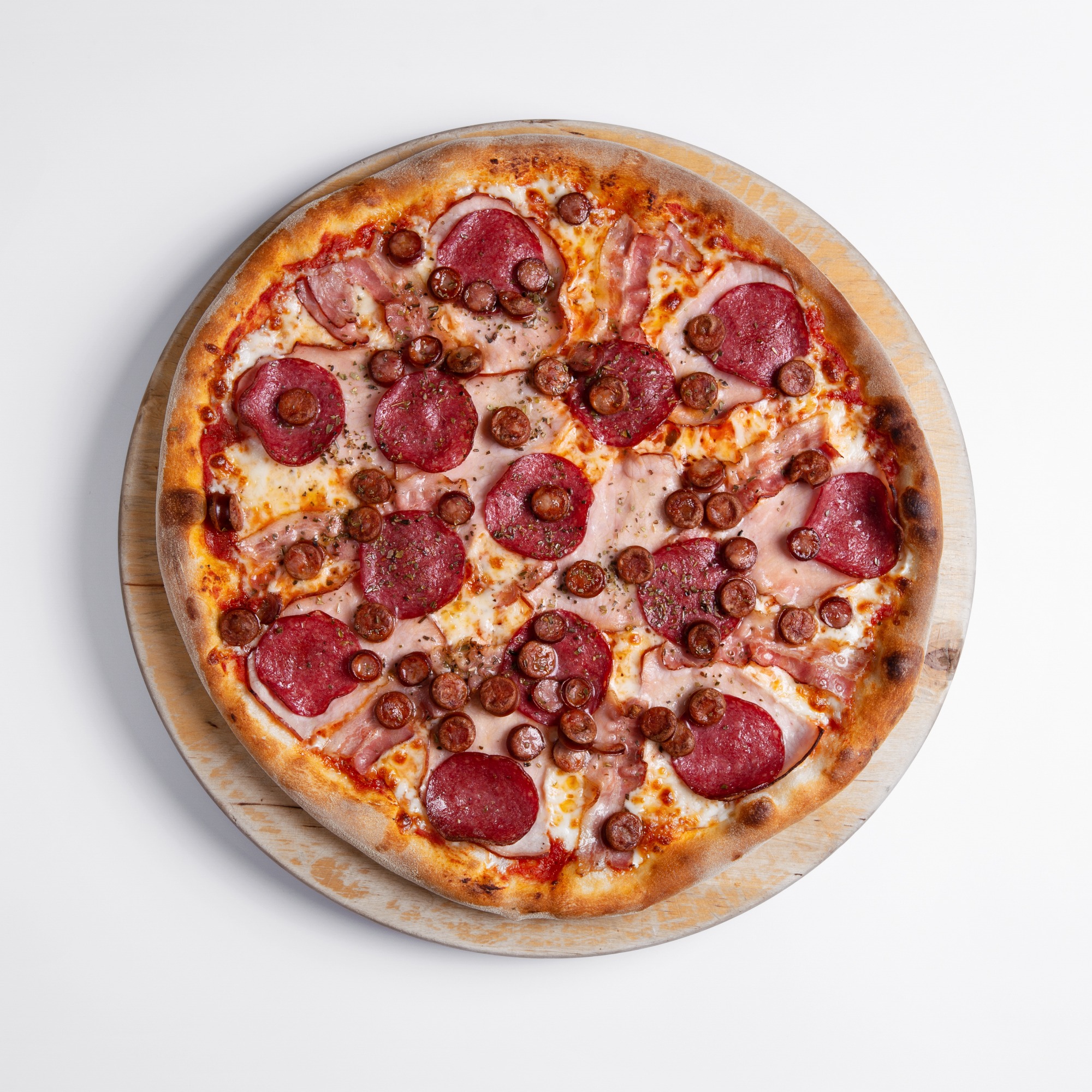 pizza z sosem pomidorowym, serem i szynką lub salami -