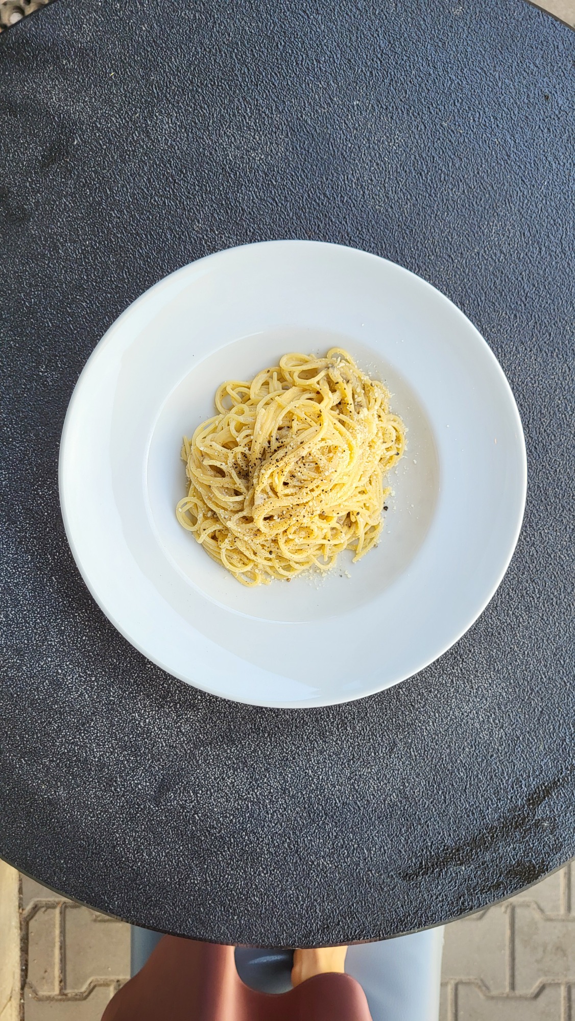 Makaron spaghetti w sosie ze smażonych pomidorków z Burrata oprószony bazyliowym parmezanem